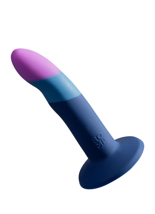 Dildoen har en deilig fasthet og en form som gir både p-punkt og g-punkt det de vil ha, enten du bruker den vaginalt, analt eller som del av dobbel penetrering. Basen har en solid sugekopp og et lite hull som passer perfekt med bulletvibratoren ROMP Riot, for deg som vil legge til ekstra vibrasjon underveis.