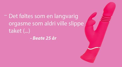 Som jeg sa tidligere så testet jeg denne med partneren min mens vi så på porno sammen, og den gjør virkelig jobben sin! Da han skrudde på thrustinga kjente jeg en intens, deilig følelse spre seg i underlivet mitt. Etter en liten stund skrudde han på ørene også, og det gikk ikke lange tiden før jeg kjente det hadde bygget seg opp en kraftig orgasme som var på tur å ta meg med storm. Og det var ikke bare en vanlig orgasme, det var en sprutorgasme.
