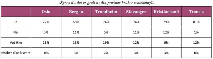 Sexleketøy er kommet for å bli og aldri før har så mange nordmenn eid et sexleketøy som nå. Faktisk svarer 79 % av oss at det er greit å bruke sexleketøy for å få et bedre sexliv. Det er flest kvinner som har tatt ulike hjelpemidler i bruk. 69 % mot 62 % menn som svarer det samme. Aldersgruppen som i størst grad tar i bruk sexleketøy enten alene eller med en partner er 30-44 år.