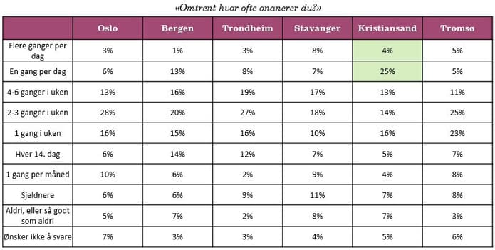 Vi har selvfølgelig tallene for de største byene er i Norge, som også muligens gir en pekepinn på de tilhørende nærmiljøene. Vi fant nemlig ut at hele 29 % av innbyggerne i Kristiansand oppgir at de pleier å onanere daglig eller flere ganger per dag. Til sammenlikning var Stavanger nummer to på listen der 15 % oppgir det samme svaret. Oslo-borgere onanerer minst. Her svarer kun 9 % det samme. Er det varmen på sørlandet som gjør innbyggerne litt kåtere enn oss andre? Uansett, er Kristiansand et hestehodet foran.