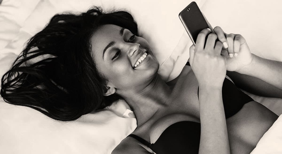 erotiske noveller: kvinne ligger på seng i undertøy med telefon