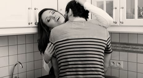 Jeg skjelver av lyst og er i ferd med å miste beherskelsen. Du merker det, slipper leppene mine og smiler litt triumferende til meg. Du elsker dette. Jeg er vill av begjær når jeg vrenger opp skjørtet ditt og løfter deg med et rykk opp på kjøkkenbordet som tilfeldigvis er ganske ryddig. Du lener deg lett bakover og jeg trekker av deg stringen og sprer bena dine godt tilside slik at den deilige våte og nybarberte fitta di står vidåpen mot meg som en vakker orkidè som bare venter på å suge meg inn i seg. Og den trenger ikke å vente lenge. Du vet at jeg elsker i slikke fitta di godt og grundig før vi knuller, men akkurat nå er jeg så sprengkåt at jeg ikke orker å vente med å komme inn i deg.