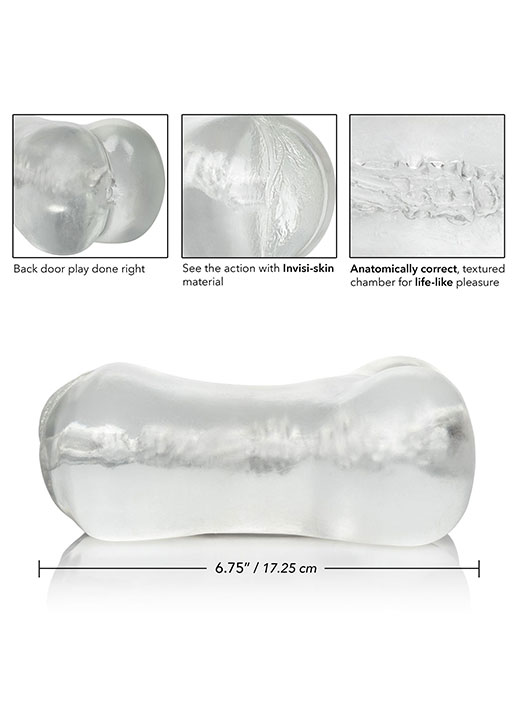 Dette sexleketøyet tilbyr en leken 2-i-1 løsning. Perfekt for deg som digger variasjon. I den ene enden har sexleketøyet en vaginalåpning, og i den andre har det en analåpning. På innsiden finnes den en kanal med pirrende tekstur, som gir deg ekstra stimulering av penis. Materialet er fleksibelt og mykt og passer de fleste penisstørrelser. Ved å klemme rundt, kan du også bestemme hvor trangt du vil ha det. Masturbatoren er transparent, hvilket gir de fleste et ekstra pirrende kick, særlig for de som liker å se på... Finn frem et vannbasert glidemiddel og ta en omgang kron eller mynt (les: foran eller bak). Valget og nytelsen er din!
