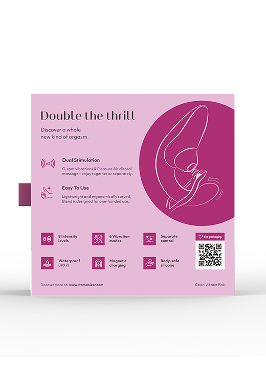 Womanizer Blend har en kompakt størrelse og en ergonomisk buet form med en fleksibel arm, som gjør den ideell for både enhånds bruk og håndfri nytelse. Utstyrt med to kraftige motorer som kan styres separat, kan du begynne forsiktig og bygge opp til en uforglemmelig klimaks med 8 forskjellige intensitetsnivåer av Pleasure Air og 3 vibrasjonsintensiteter med 3 vibrasjonsmønstre – massasje, bølge og puls. Vi sier bare wow!