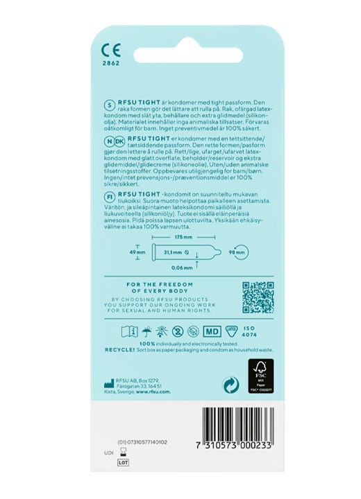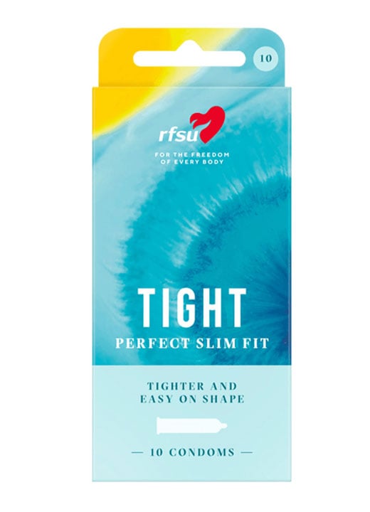 RFSU Tight er "Slim fit"-kondomer, utviklet med tanke på å være lett å tre på. Kondomet skal sitte som støpt, uten fare for at det glir av i farten. Derfor passer dette kondomet ekstra godt til ungdom, og til deg som ønsker et kondom med enda tettere passform enn Profil kondomer. Kondomet er vegansk i tillegg!