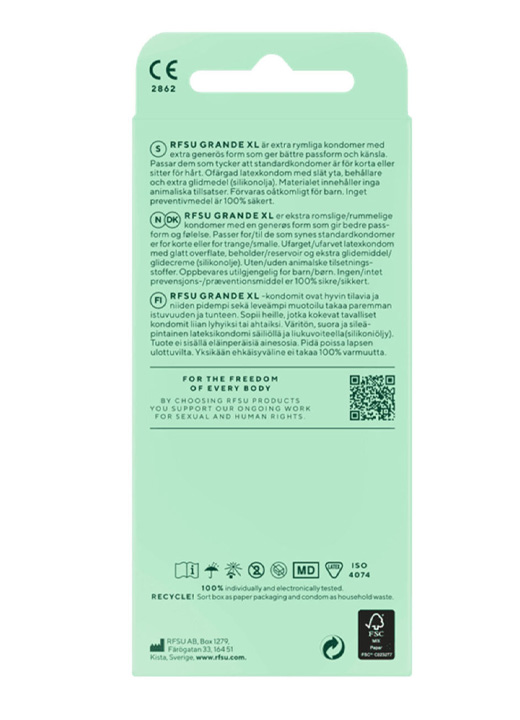 Kondomen er tynn og enkel å rulle på. Den har en generøs passform og er både bredere og lengre enn "standard-fit". RFSU sine kondomer er sikre, enkle og nøytrale på lukt.